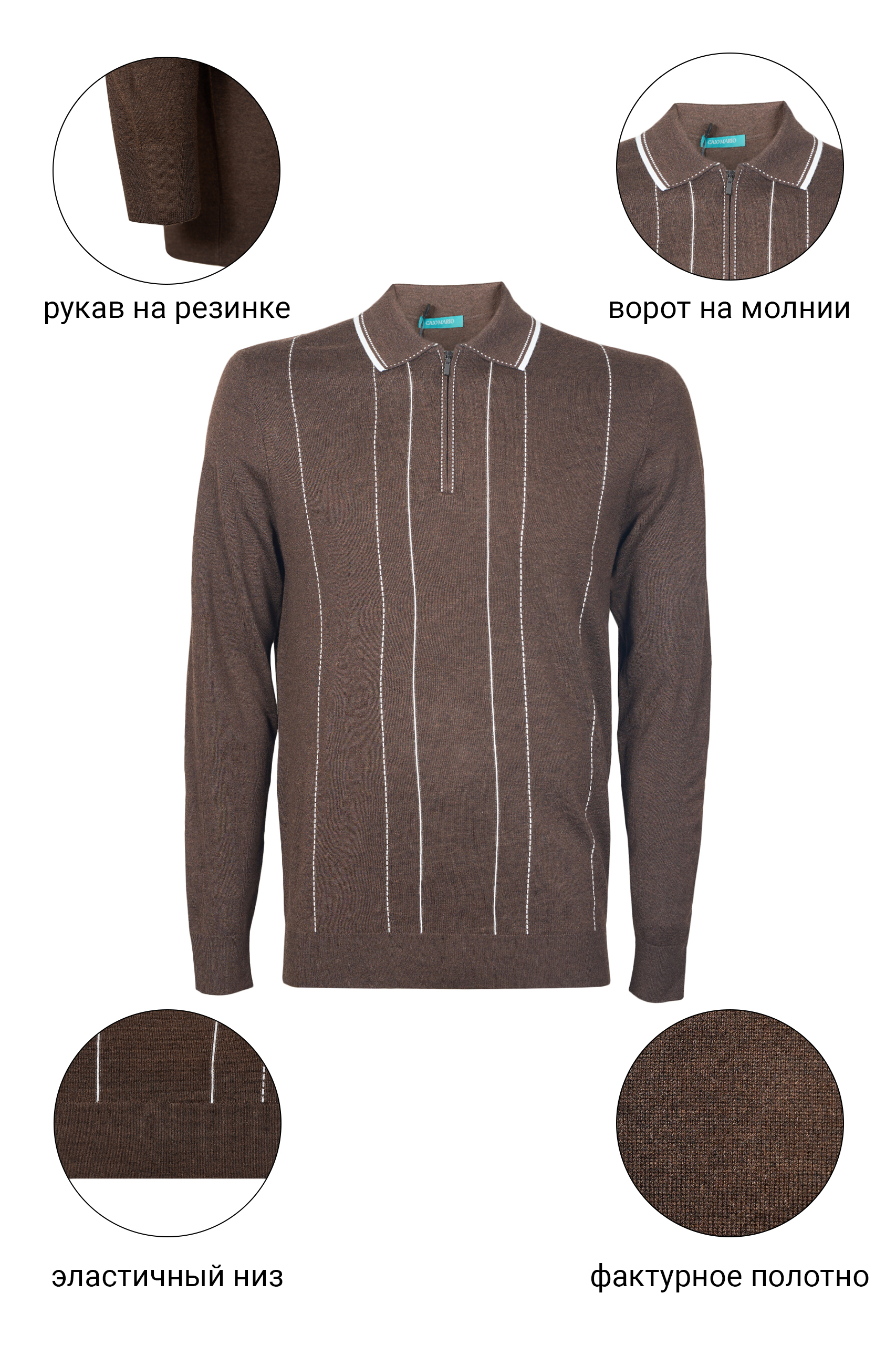 • Джемпер-поло CAIOMARIO полуприлегающего силуэта из высококачественной шерсти мериноса «Merino wool» с добавлением кашемира, акрила и п/э. «Merino wool» это тонкая, мягкая и очень качественная шерсть. Она ценится за свои уникальные свойства, такие как превосходная терморегуляция (сохраняет тепло в холод и прохладу в жару), гигроскопичность (хорошо впитывает влагу, но быстро сохнет) и приятная на ощупь мягкость, благодаря которой она не «колется». Воротник отложной. Застежка на короткую молнию. Низ изделия и рукавов на резинке. Прекрасно сочетается с джинсами и брюками . Стильная и элегантная вещь отлично подойдет для повседневной носки. Выбирайте качество, выбирайте стиль, выбирайте CAIOMARIO!